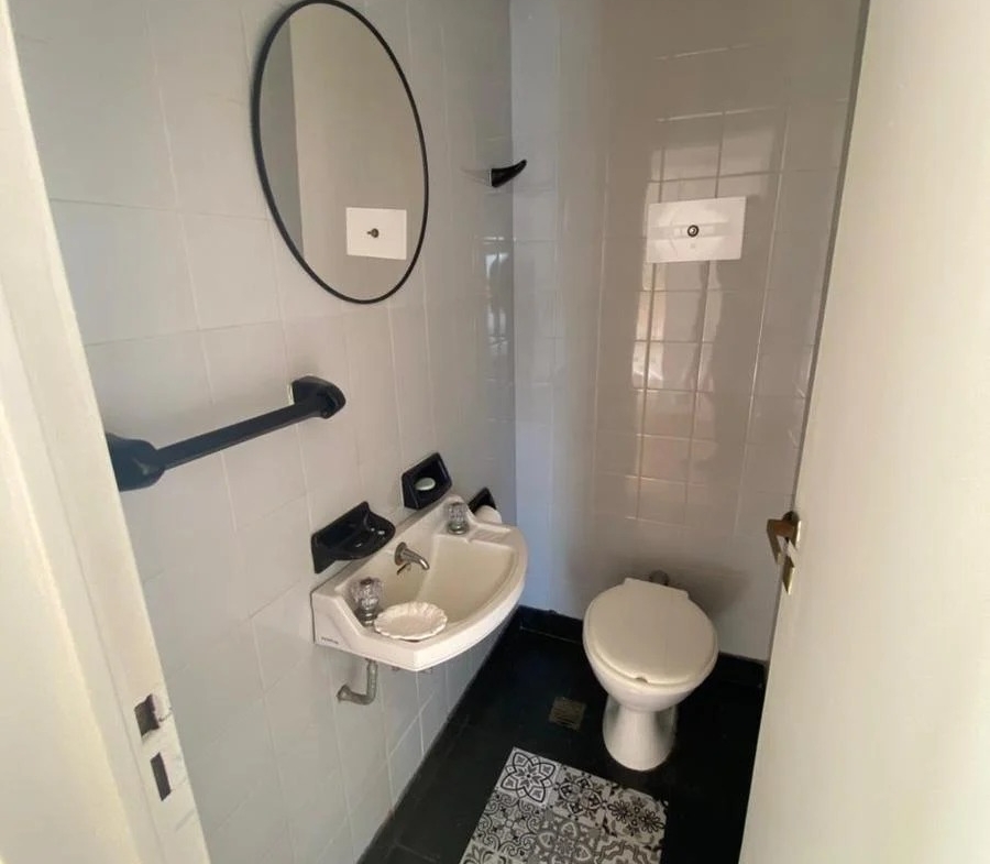Baño Principal: Cerámicos antideslizantes. Azulejos de piso a techo en tono gris celeste; sanitarios de loza blanca. Incluye bañera y vanitory de guardado clásico.