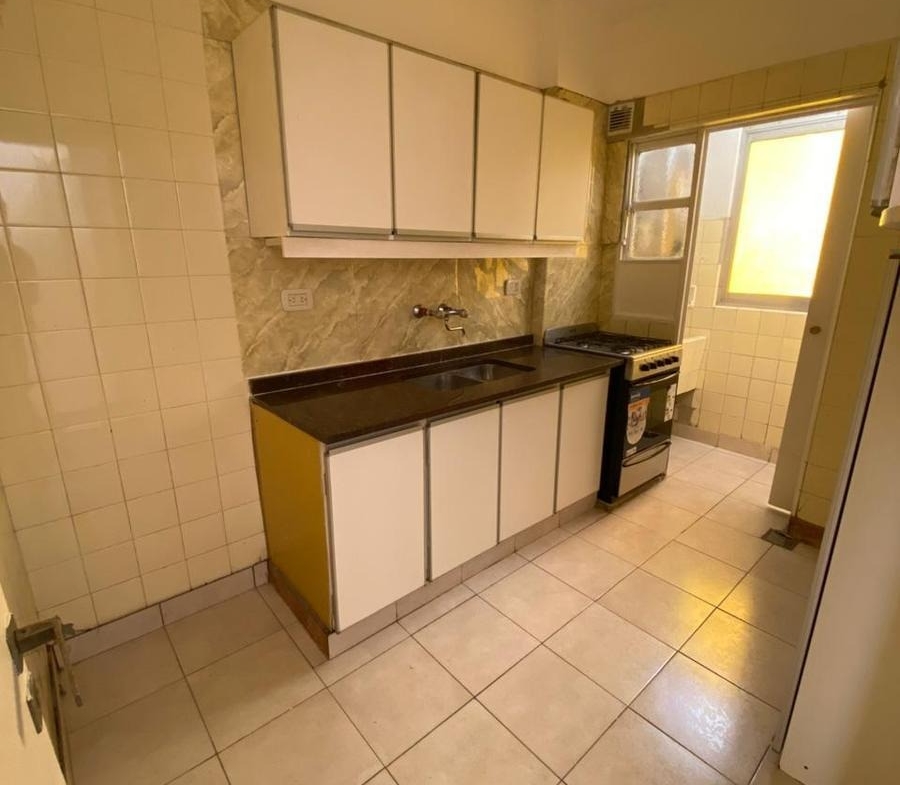 Cocina: Cerámicos de alto tránsito en tonos neutros. Azulejos cerámicos rectangulares y frente de mesada en mármol/granito. Mobiliario bajo mesada y alacenas en melamina blanca con perfiles de aluminio.