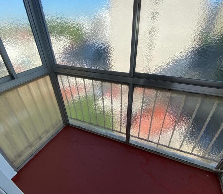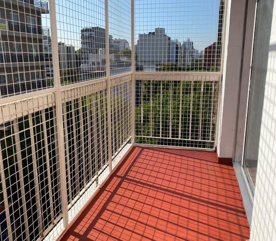 Balcón Baldosas rojas de exterior (tipo laja o cerámica rústica). Barandas metálicas con malla de seguridad y perfiles de aluminio. Superficie impermeable de fácil mantenimiento.