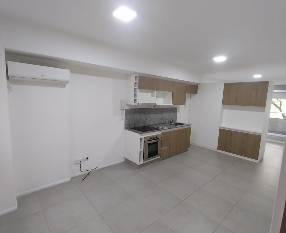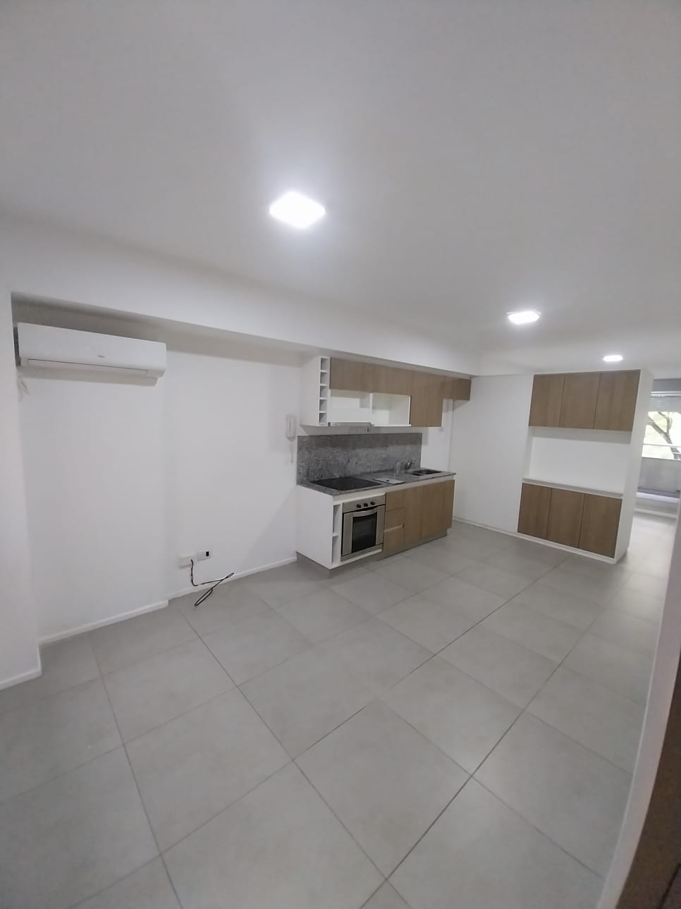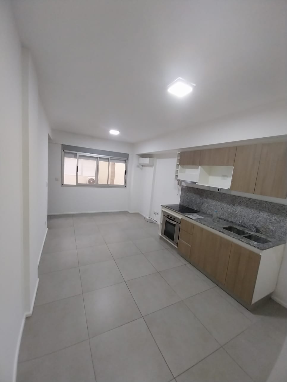 Cocina integrada, moderna y funcional, equipada con anafe eléctrico vitrificado, horno empotrado eléctrico, mesada de granito, bacha de acero inoxidable y muebles bajo mesada y alacenas.