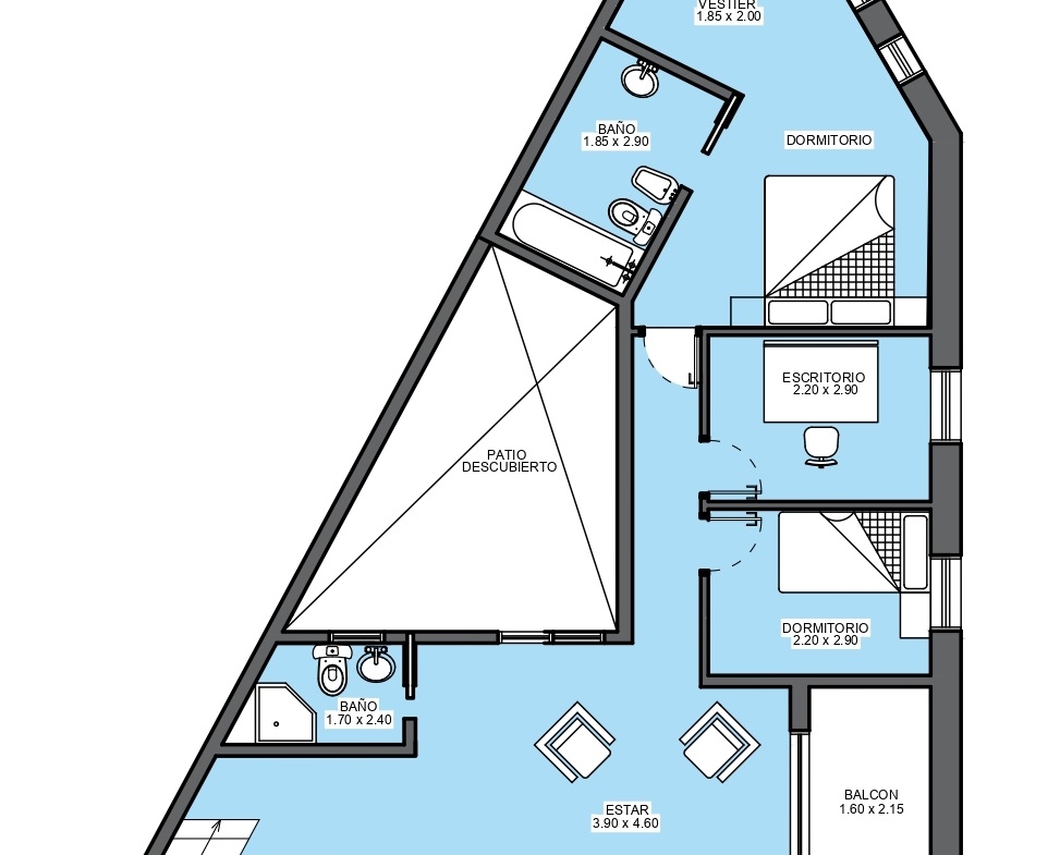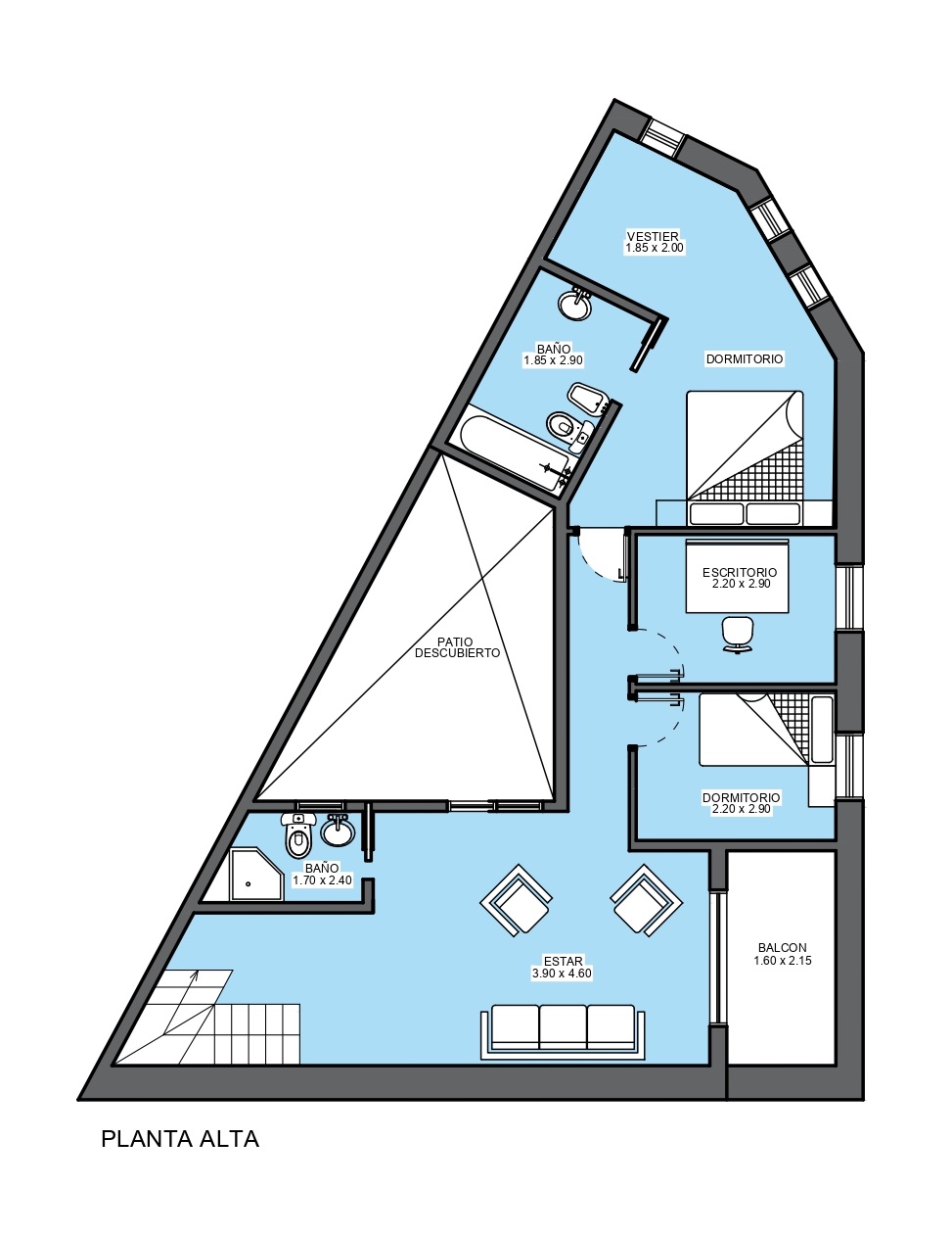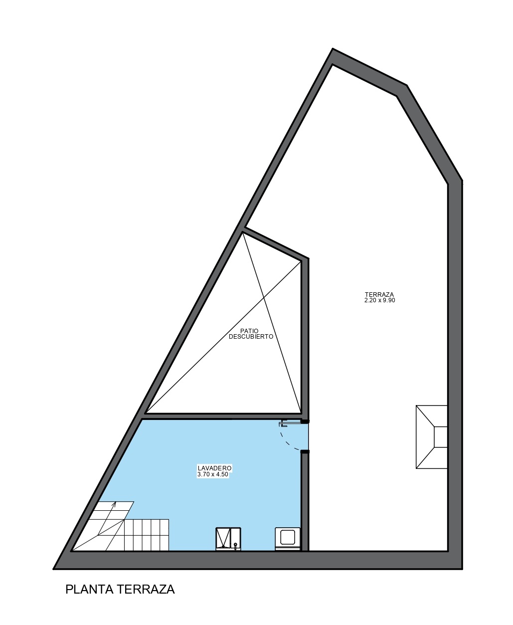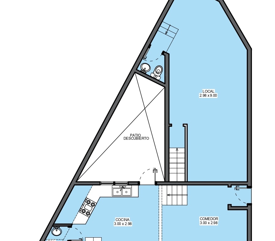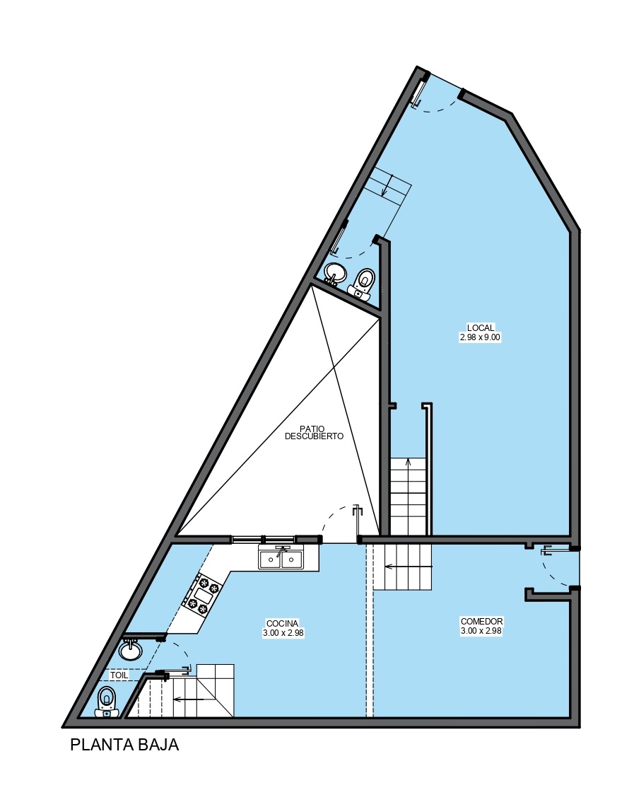 – 2 locales comerciales al frente: uno de 15 m² y otro de 90 m²