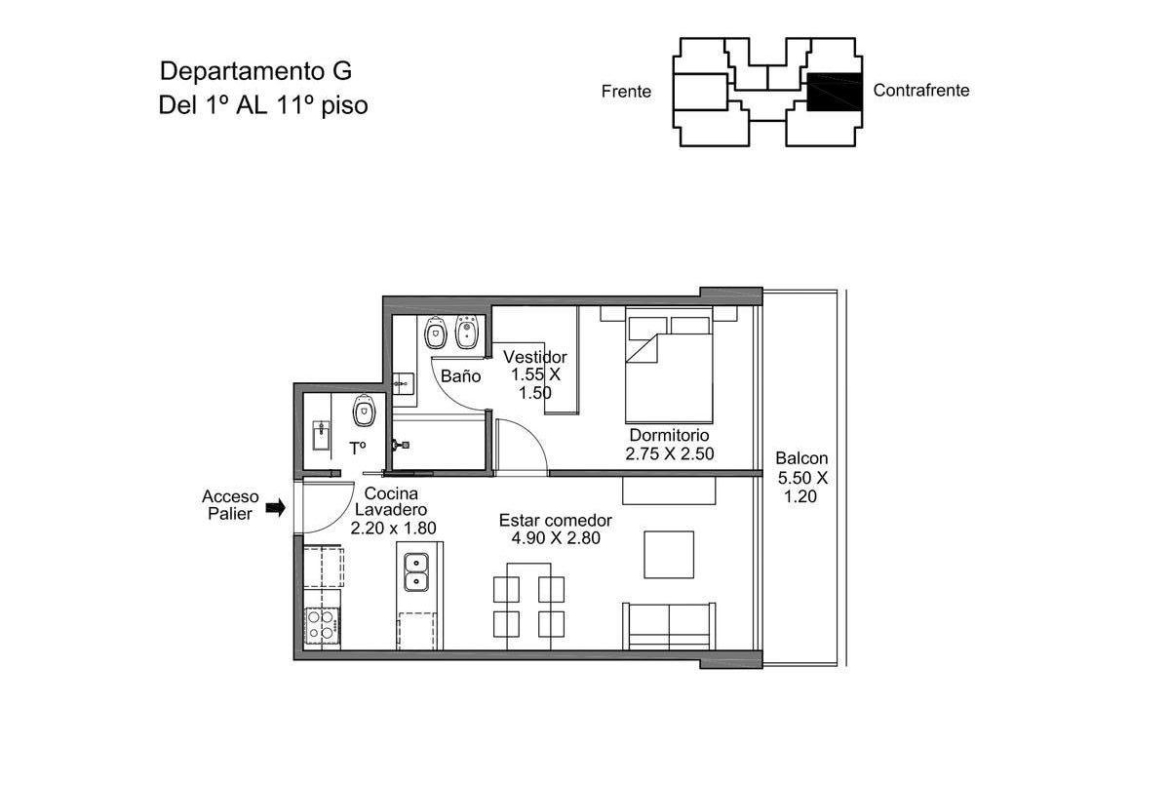 Living–comedor con cocina integrada equipada con anafe y horno eléctrico, espacio de lavadero y toilette de recepción.