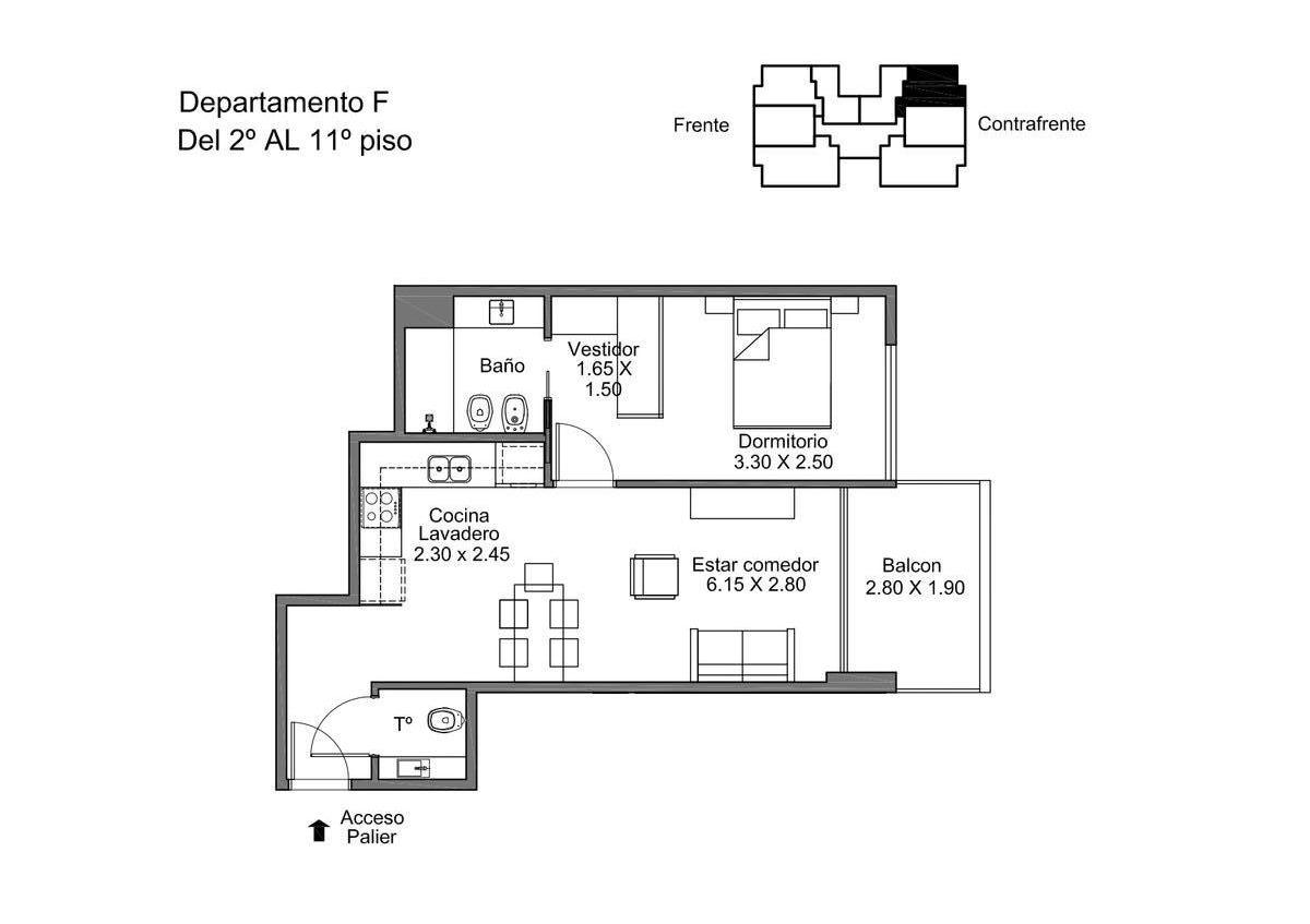 Al ingresar, se encuentra un toilette de recepción. Luego, se accede a un luminoso living-comedor con cocina integrada equipada con anafe y horno eléctrico y sus respectivos espacios de guardado tanto alacena como bajo mesada y lavadero, que conecta a un balcón al contrafrente.
