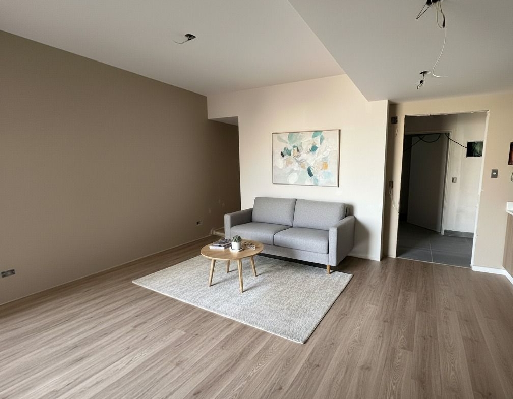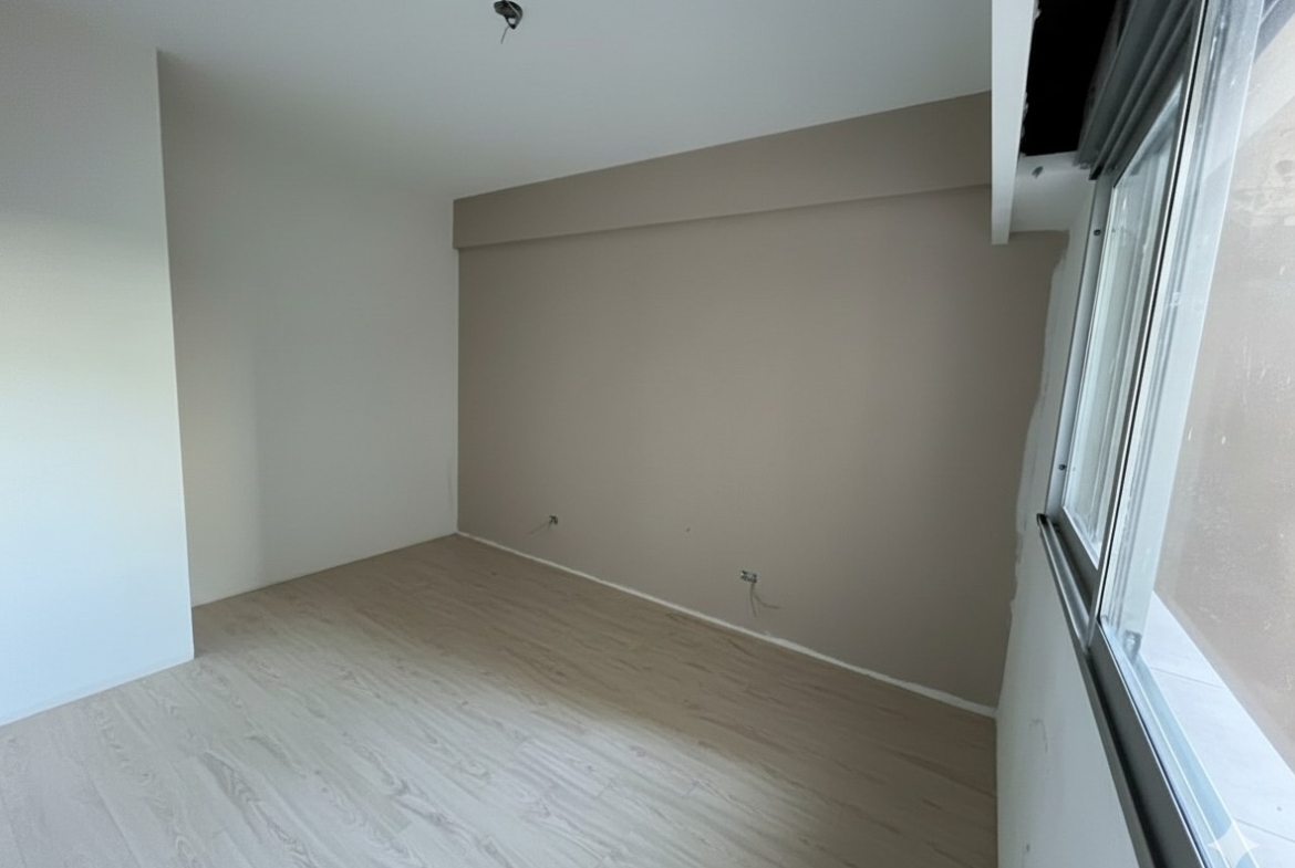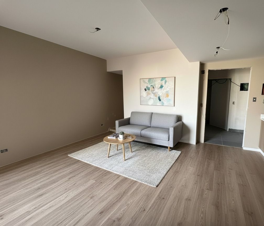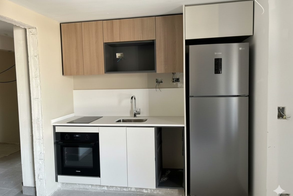 Amplio living–comedor con cocina eléctrica integrada, equipada con anafe y horno, muebles de cocina de primera calidad (alacenas y bajo mesada) y ventana lateral que aporta luz y ventilación natural.