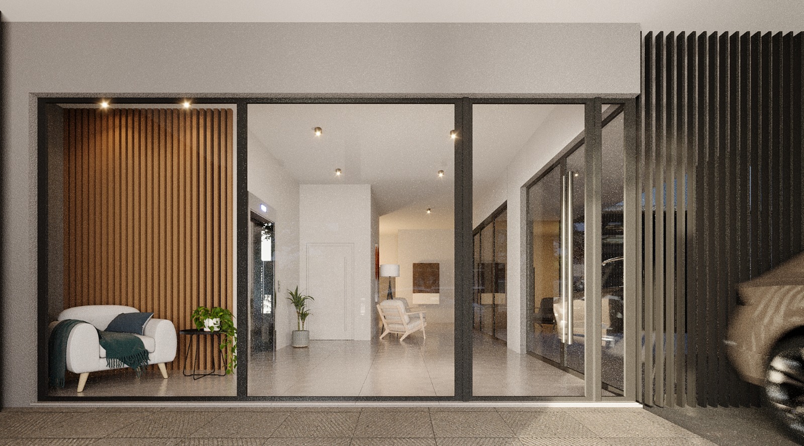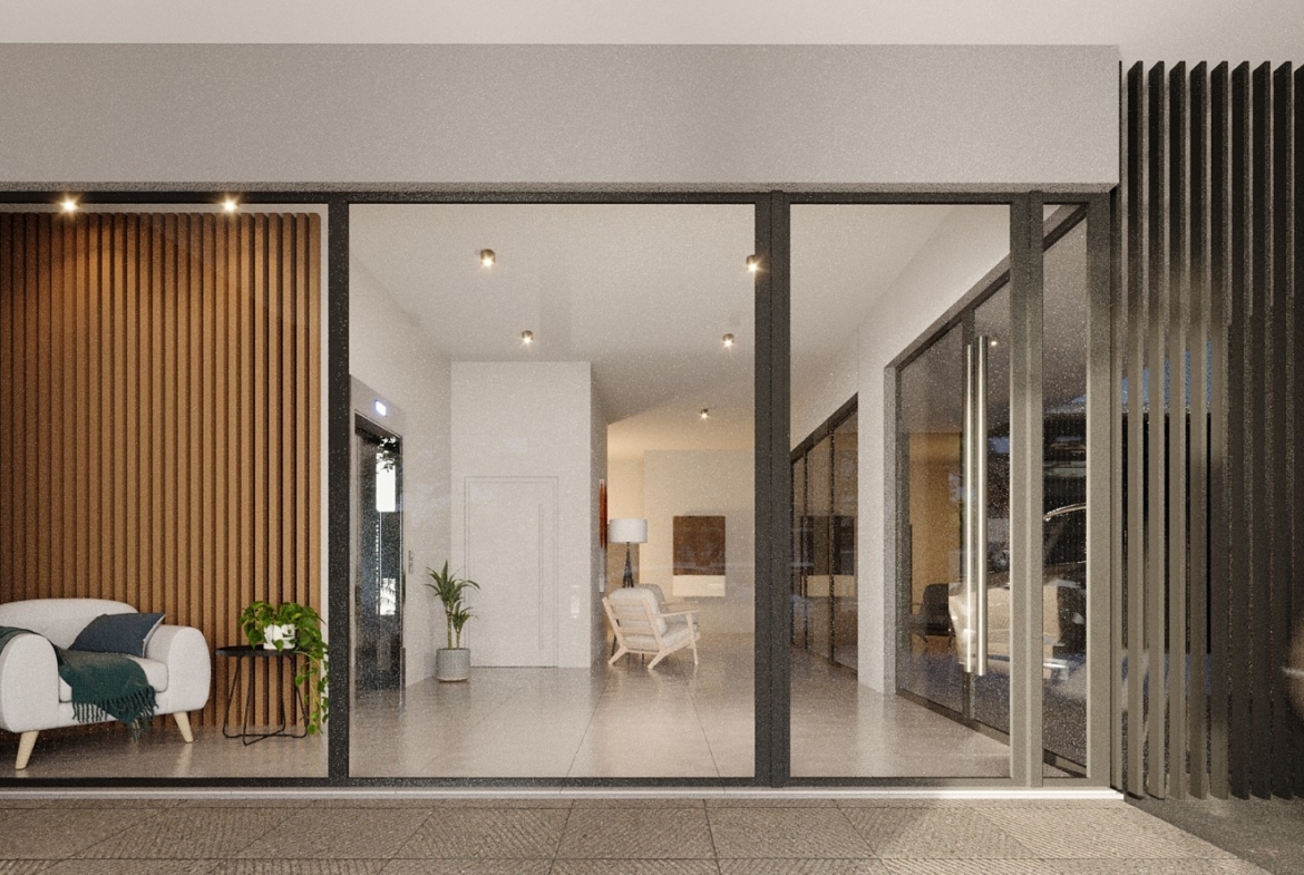 – Hall de acceso con diseño contemporáneo: cerramiento de vidrio templado, iluminación LED y portón vehicular motorizado.