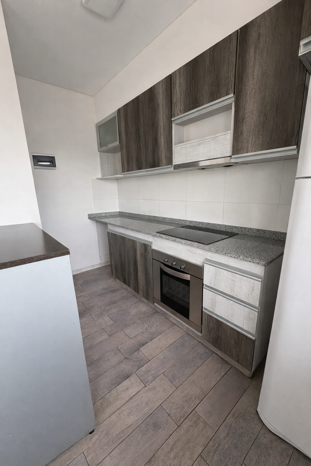 Cocina eléctrica semi independiente mediante barra desayunadora, equipada con anafe vitrocerámico de 4 hornallas, horno y spar de ventilación