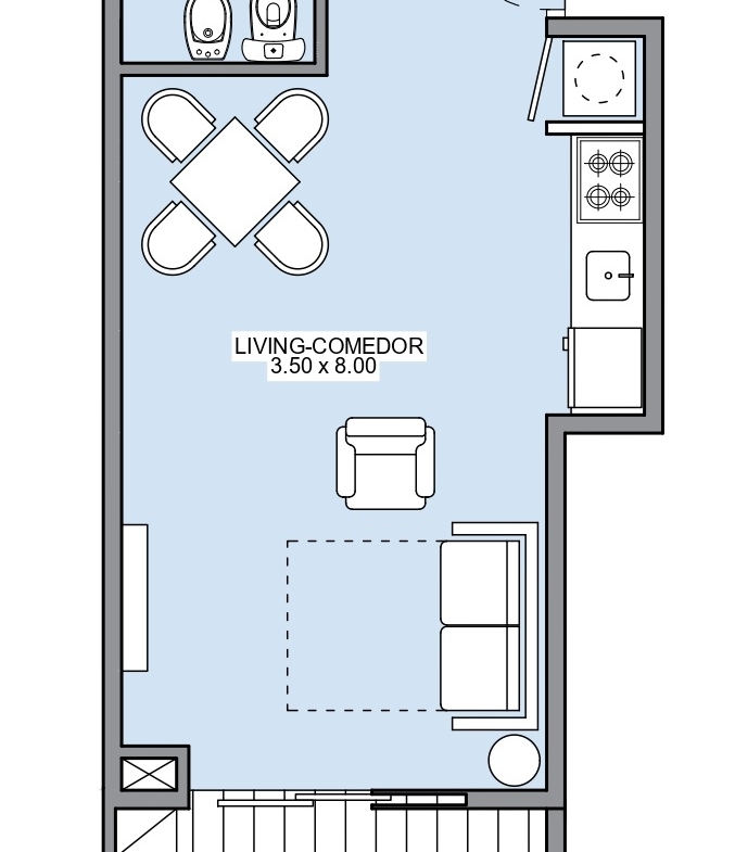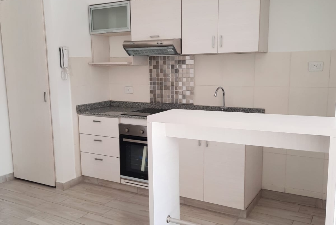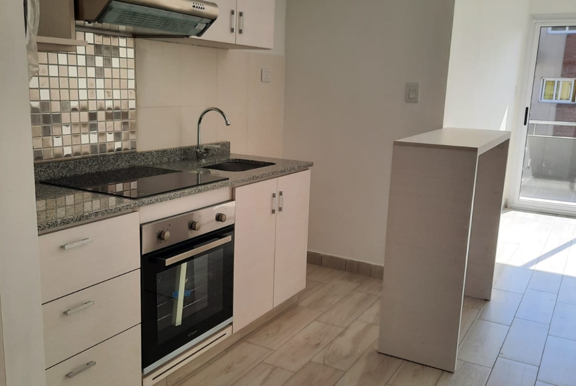 Monoambiente con cocina integrada al living comedor y salida al balcon con parrilla y baño.