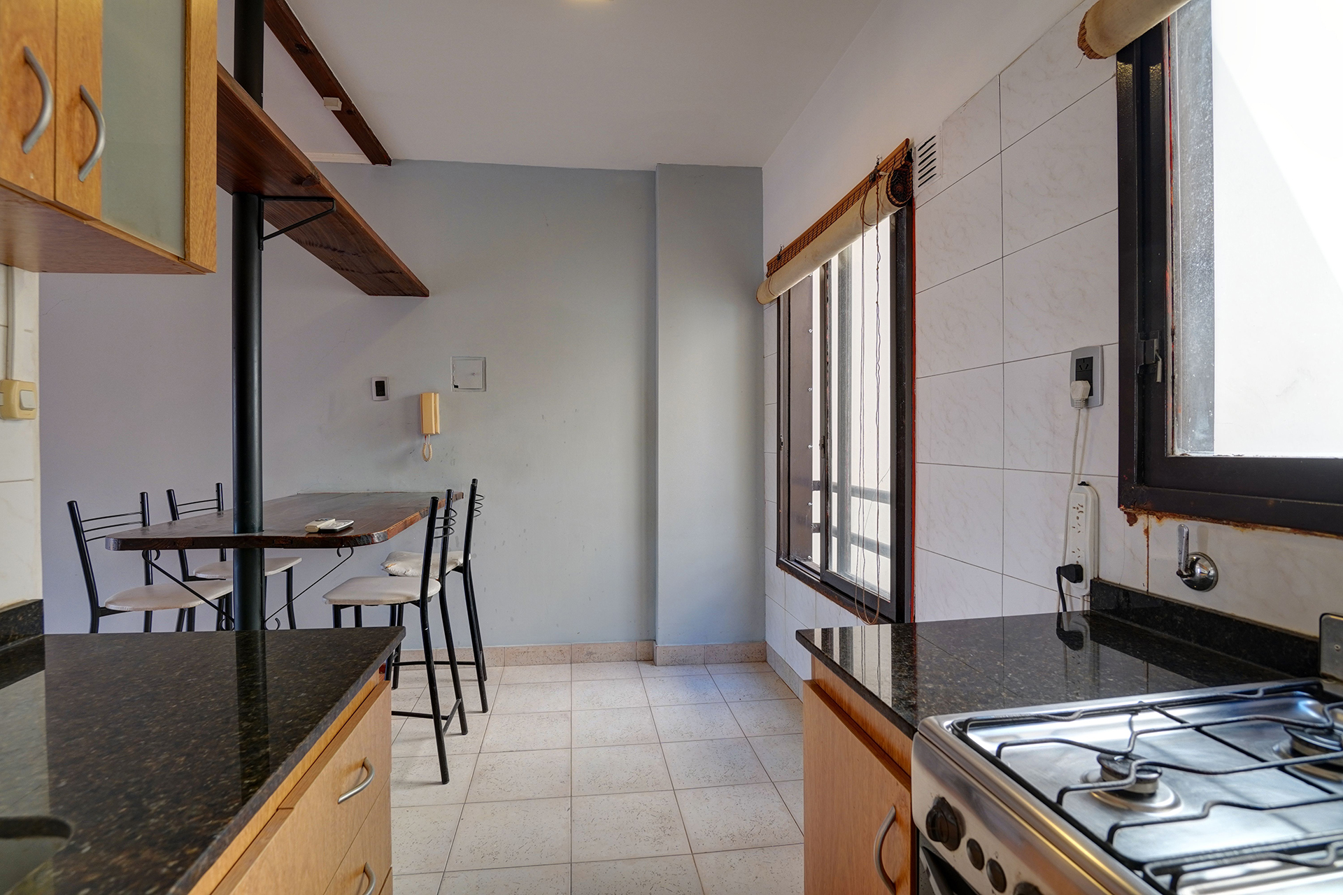Cocina integrada con mesada tipo desayunador dividiendo el comedor diario del living comedor.