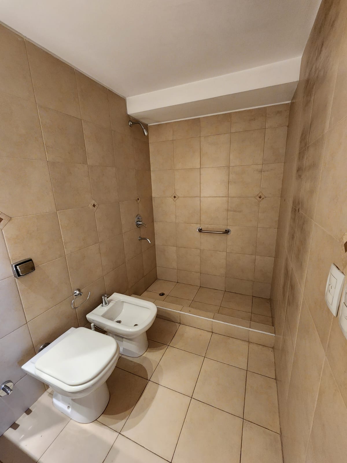 Baño: Equipado con inodoro, bidet, bacha de acero inoxidable sobre vanitory de melamina blanca y ducha (baño completo).