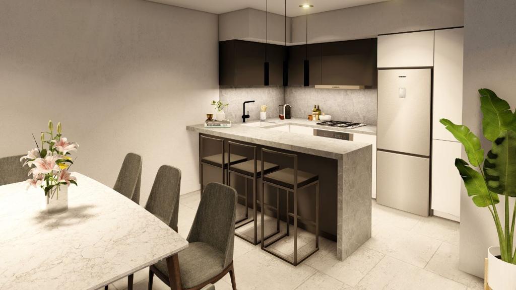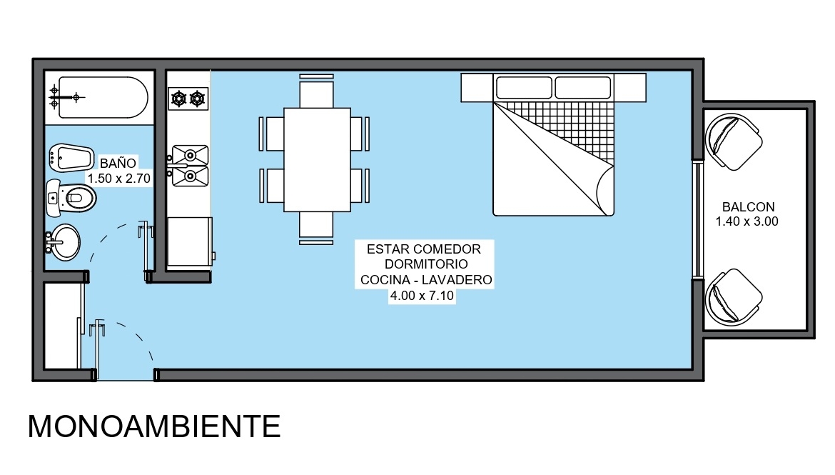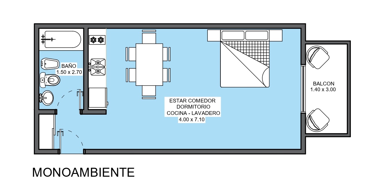 Departamento de 1 ambiente con cocina integrada al living comedor y baño.