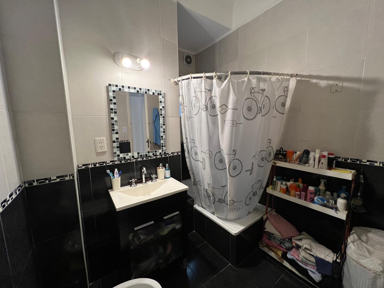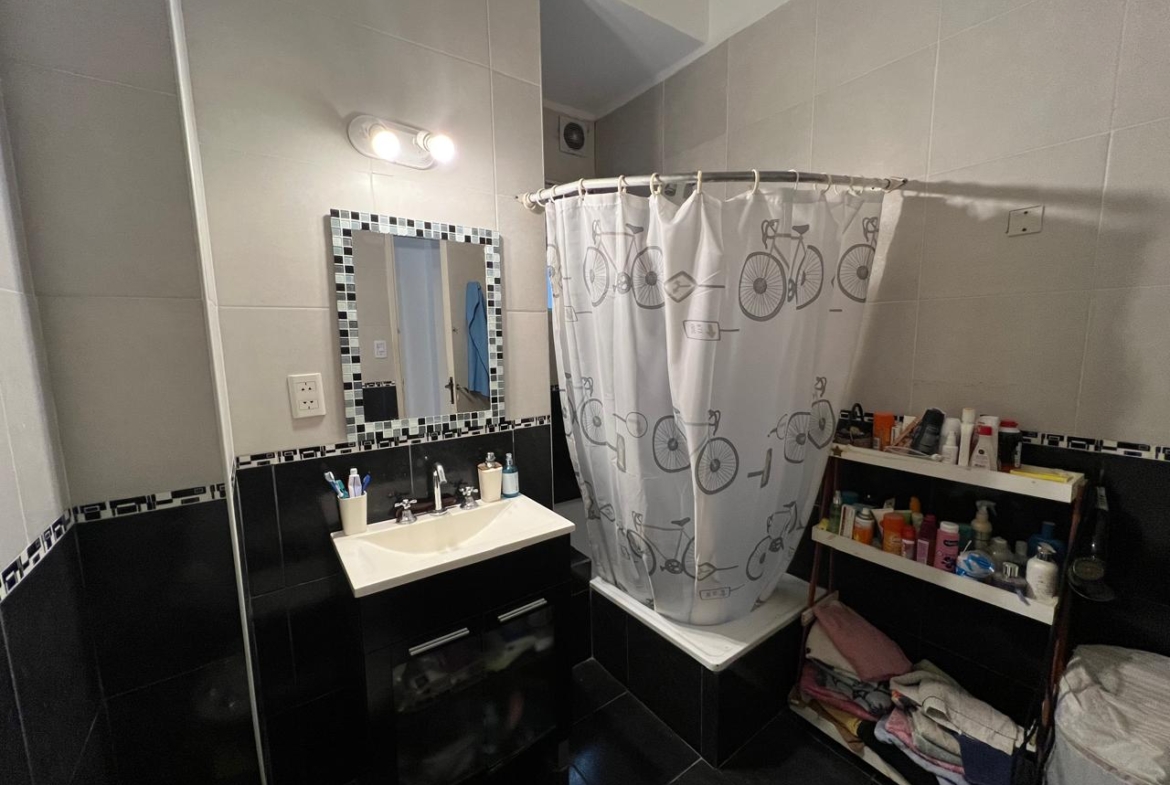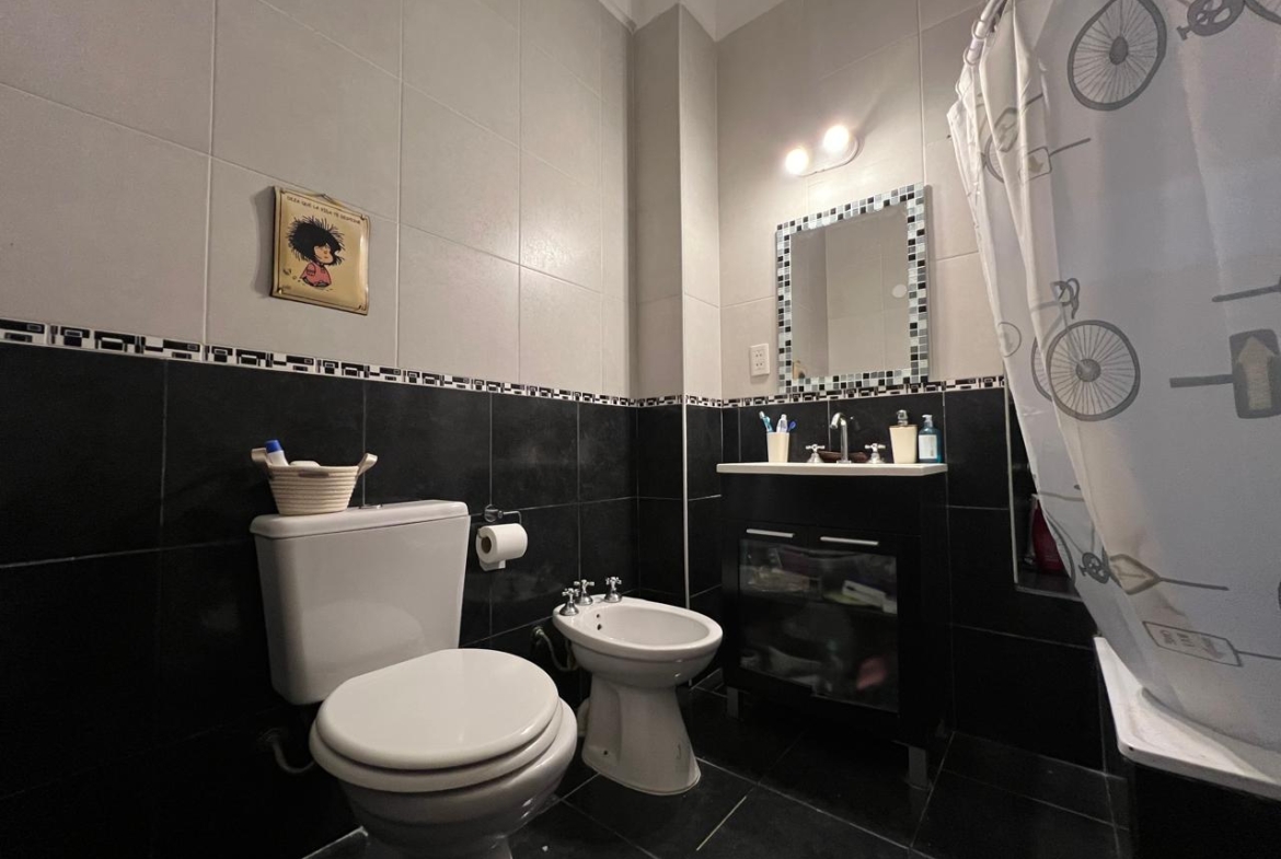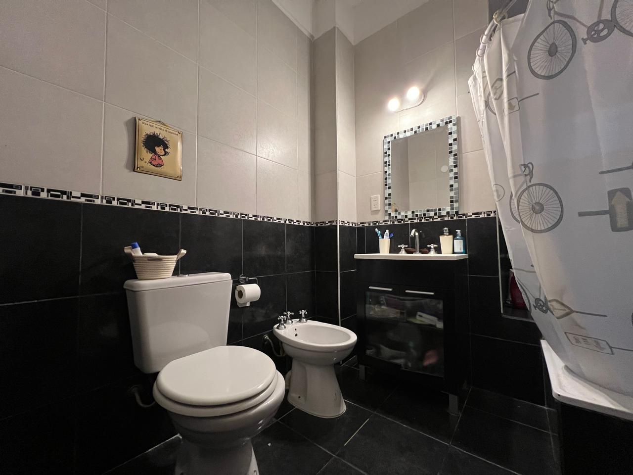 - El baño cuenta con revestimientos modernos, bañera, y ventilación natural.