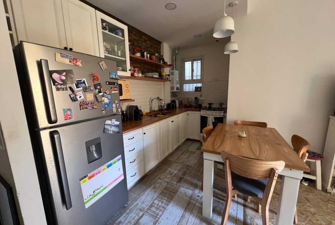 - Al ingresar, nos encontramos con un ambiente integrado de cocina y comedor diario, renovado, con muebles de diseño moderno, mesada de madera, mucho espacio de guardado y una disposición práctica que se conecta directamente con el living. Este espacio social es amplio, muy luminoso y con salida al patio, lo que lo convierte en un lugar ideal para disfrutar el día a día.